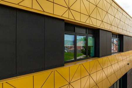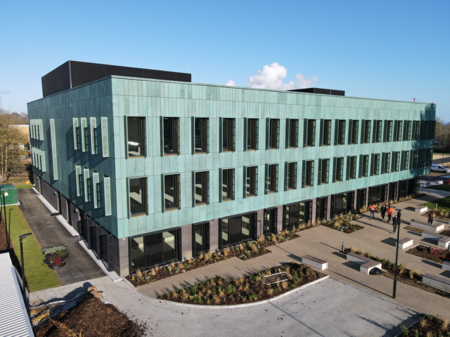 Wrexham University’s new Enterprise, Engineering and Optics Centre presents a bold architectural identity that aligns with its focus on innovation, sustainability and forward thinking design. A key feature of the façade is the use of EQUITONE [natura], a through coloured fibre cement material fabricated by Gordian Building Solutions. Specified in the deep N074 Obsidian tone, the panels add refined architectural depth that complements the contemporary form of the building.