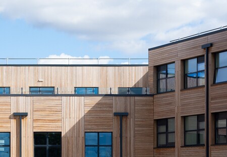 Beyond aesthetics, EQUITONE [natura] was selected for its exceptional performance credentials. Made from a mineral-based blend of cement and cellulose, the panels are durable, low maintenance and fully recyclable. They offer excellent fire, weather and impact resistance, all essential qualities for a high-traffic educational environment.